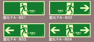 | 蓄光FA801〜804・FA701〜703はJIS Z9107適合タイプです。(新蓄光=アルミン酸塩化化合物系) 平成18年度改正の消防法令にて定義づけされた「※蓄光式誘導標識(⇒中輝度蓄光式誘導標識)」です。 ※D65常用光蛍光ランプにて照度200lxを20分間照射し、照射停止20分後の表示面輝度が⇒ 24mcd/u以上(中輝度蓄光式:24mcd/u以上100mcd/u未満)のもの (財)日本消防設備安全センター認定品(中輝度での認定製品です) |