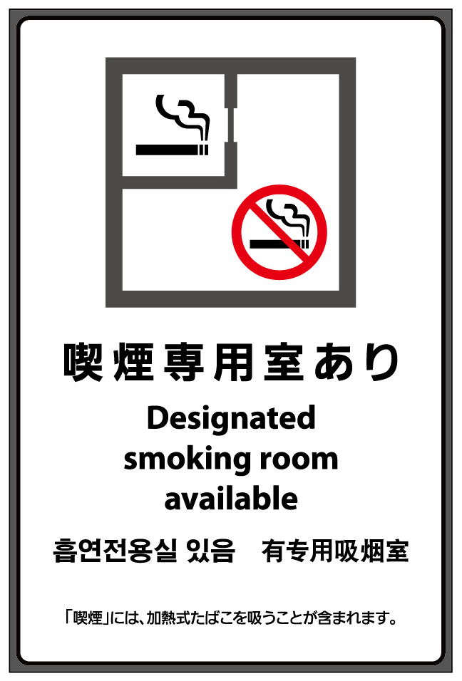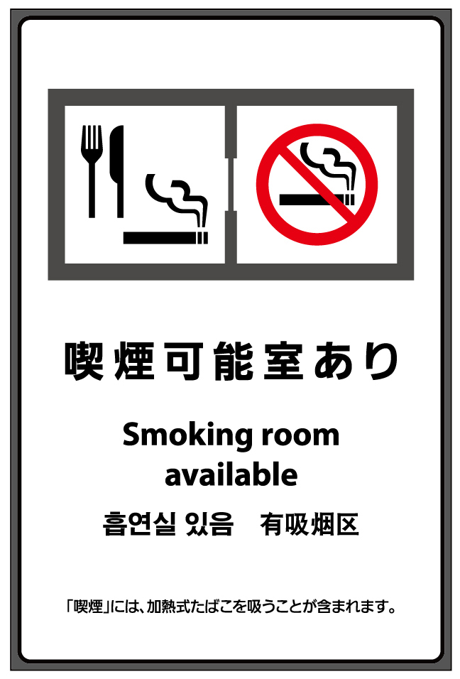 | 加熱式たばこを喫煙しながら食事などができる「加熱式たばこ専用喫煙室」を施設の一部に設ける場合に、施設(店舗)入口に掲示するものです。 | |||||||||||||||||