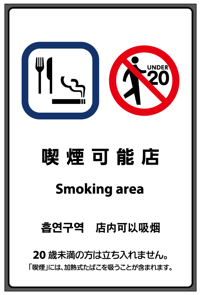 | 一定の要件を満たして届け出をした小規模な既存飲食店において、その施設(店)の全体が喫煙と飲食サービス提供可能(喫煙可能室)とする場合は「喫煙可能店」であり、施設自体への20歳未満の立ち入りは禁止されます。 | |||||||||||||||||
