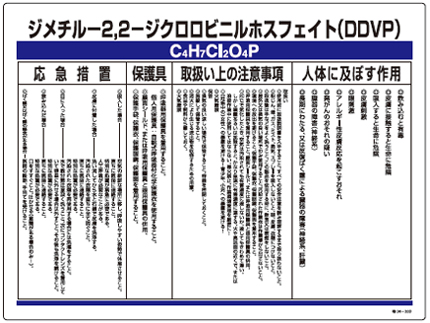 特定化学物質障害予防規則(特化則)・特定化学物質/特別管理物質の有害危険性に関する掲示物●特38-320(「ジメチル-2,2-ジクロロビニルホスフェイト(DDVP)」)※2014年の特化則改正に伴い特別管理物質に追加 |