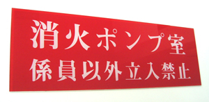 | 機械室・消火ポンプ室の扉への貼り付けに適した300×100ミリサイズの表示板です。 透明アクリル板の裏印刷タイプのため、印面は透明板の奥に封入されており、長期に亘り表示内容を汚損や劣化から保護します。 |