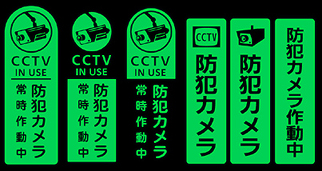 | 明るいうちに光を蓄え、暗所で数時間発光します。 消灯直後の短い時間に最も輝度を発揮するものですので、屋外よりも主に屋内待機侵入型の犯罪向きです。 (当社では、避難誘導標識との誤認を防ぐ目的から、蓄光タイプでは丸または縦型のレイアウトを推奨しています。) 『防犯監視装置』『防犯カメラ』『自動警報装置』 |