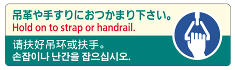 | 多くの人が利用する交通機関には、利用案内や安全上の注意事項などが判りやすく表示されるべきです。 昨今増加する外国人の利用者に対しても、車内事故の防止とスムーズな交通機関の利用を提供するために、日本語表記に加えて英語/中国語/韓国語などを併記した、さまざまな案内用サインをご提供します。 水ぬれや汚れにも強い軟質塩ビフィルム製の素材に、表面保護フィルムを加工した製品となっています。 受注生産品のため、ご注文より出荷まで通常3〜4日の納期を頂きますが、貴社イメージに合わせたカラーの変更やご社名入りなども容易に対応できますので、お申し付けください。 |